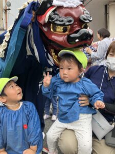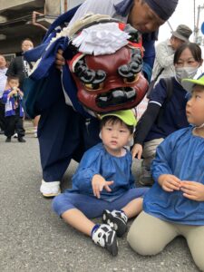 『元気でもっともっと大きくなぁれ』の願いを込めて獅子舞に頭をカプリ!