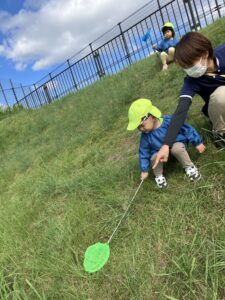 バッタがピョンピョン跳んでいるのを見つけ、虫取り大会に☺