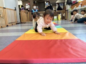 両手をついてお馬さん。前のお友だちを追いかけるよ~!「まてまて~」😊