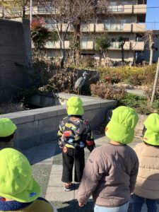 公園に着くと大きな鳥を発見!そーっと近づいてささやくように「おはよう
