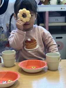 たくさんのドーナツがでてきてワクワクの子どもたち😊かわいいお皿にドーナツをおいて、コップをもって「おめでとう~🎉」
