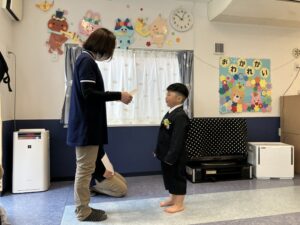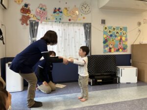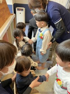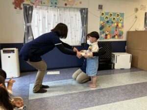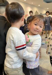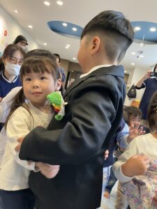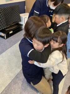 小さなお友達と握手をした後は、お大好きなお友達や先生たちと『むぎゅ~大好き』