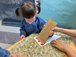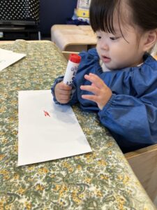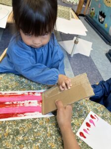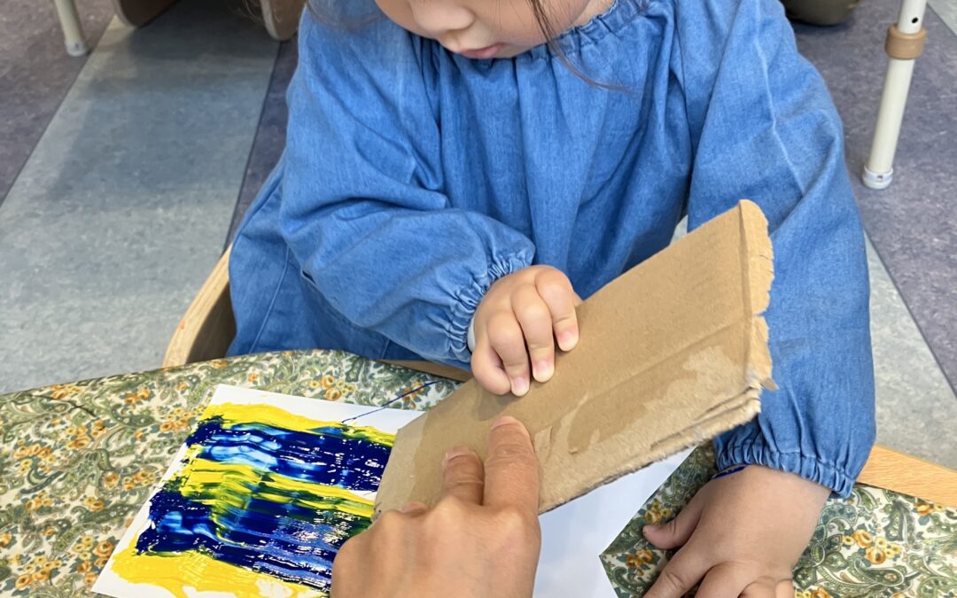 段ボール紙を絵の具の上を滑らせる技法にも挑戦!思いがけない模様に歓声があがりました👏さすが2歳児さんですね❤