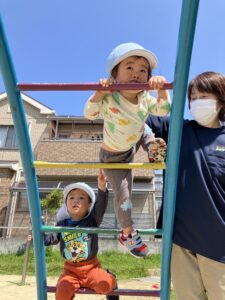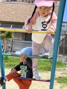 うんていにチャレンジ!傍についている先生の方がドキドキです💦