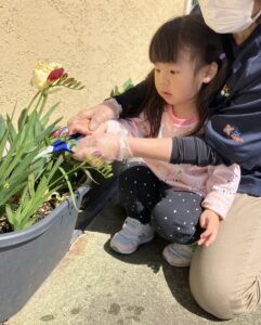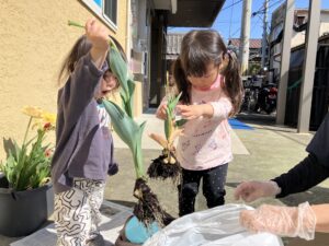 くじら組のお友達は咲き終わったチューリップを先生と一緒にお片付けしてくれました。